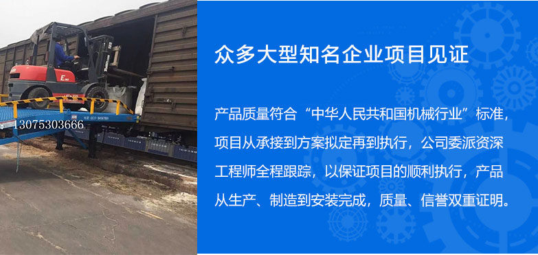 >> 13年的登車橋設(shè)備制造經(jīng)驗(yàn) 集設(shè)計、研發(fā)、生產(chǎn)和銷售于一體的制造型企業(yè),專業(yè)制造液壓登車橋,移動式登 車橋和高空作業(yè)平臺,經(jīng)驗(yàn)豐富,擁有強(qiáng)大的成產(chǎn)技術(shù)和完善的管理模式。 >> 引進(jìn)國際先進(jìn)施工工藝 配備整套專業(yè)自動化生成設(shè)備,引進(jìn)國外先進(jìn)技術(shù), 定期培訓(xùn),確保設(shè)備的高品質(zhì)。 產(chǎn)品具有設(shè)計新穎、結(jié)構(gòu)合理、升降平穩(wěn)、載重安全、操作簡單、維護(hù)方便等優(yōu)點(diǎn)。